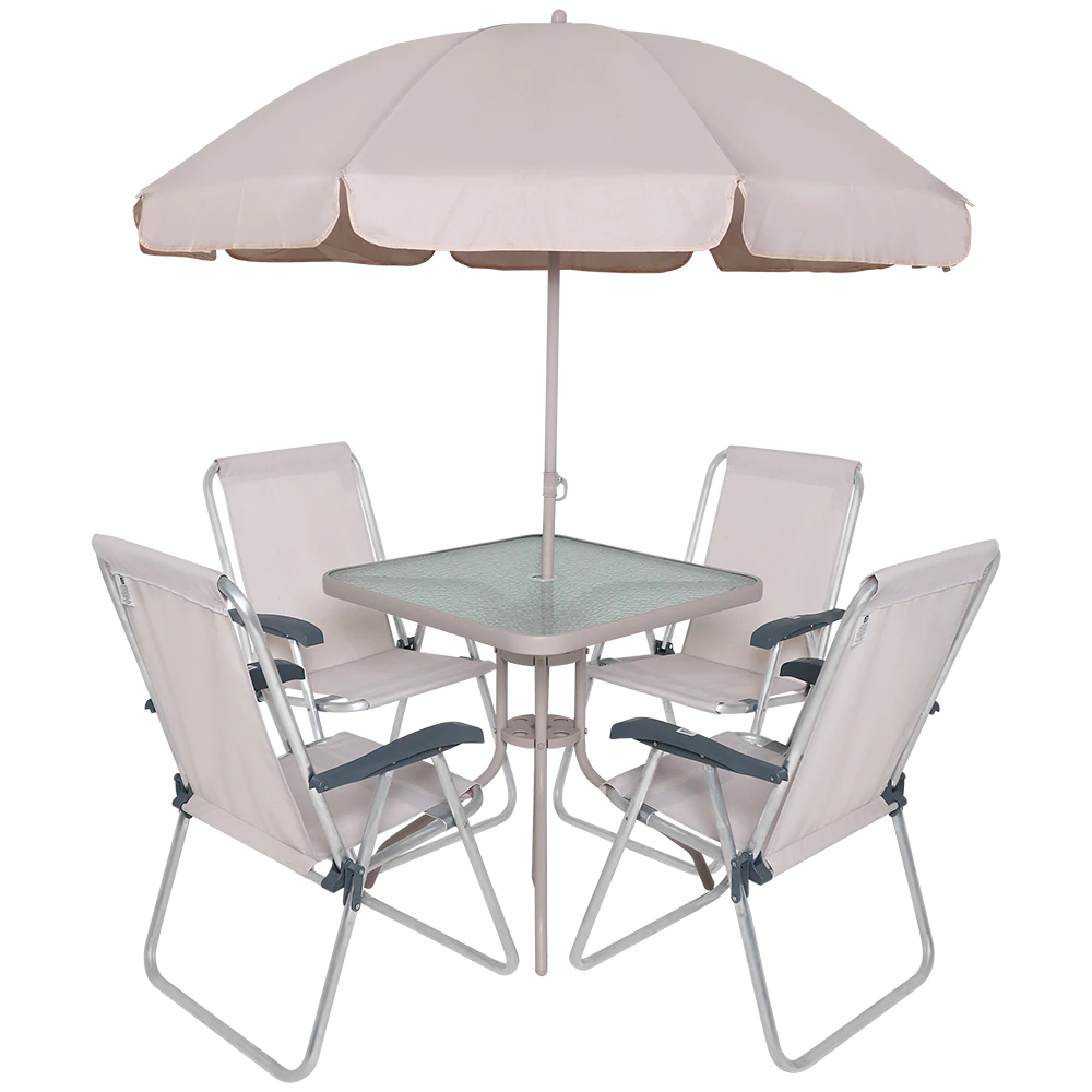 Principais características: - Mesa quadrada: espaço ideal para refeições e convivência - 4 cadeiras ergonômicas: conforto e resistência para uso diário - Ombrellone bege: proteção eficiente contra o sol, com tecido resistente e fácil de limpar - Material durável: estrutura robusta que garante longa vida útil mesmo em uso externo